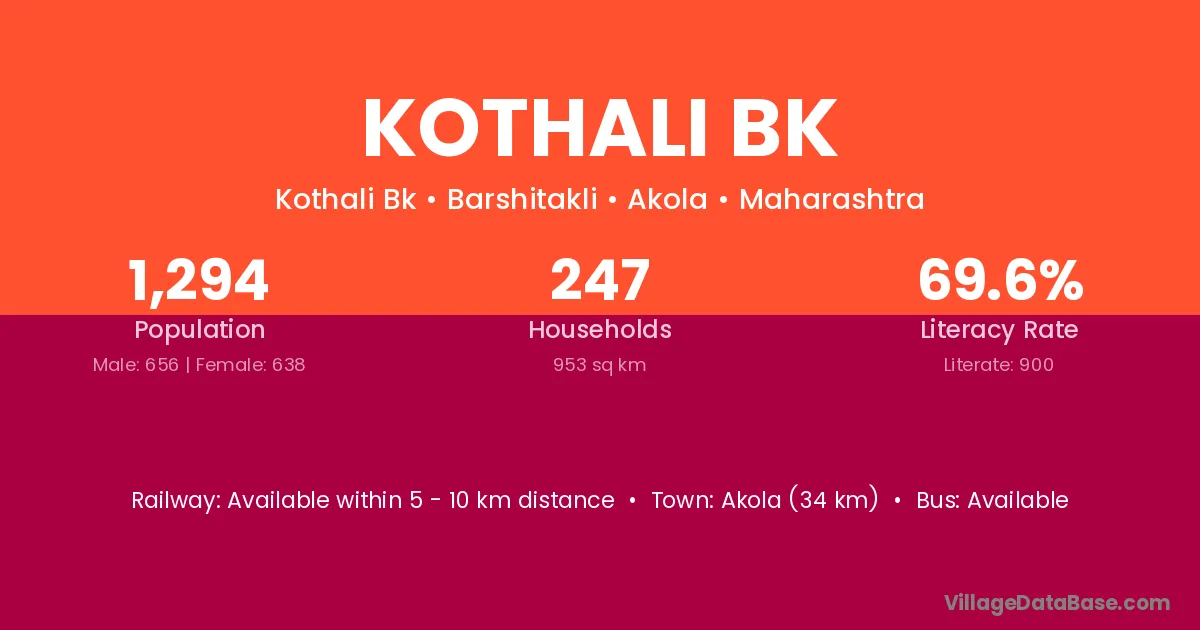 Akola (34 km) is the nearest town to Kothali Bk village for major economic activities and is located approximately 34 km away.