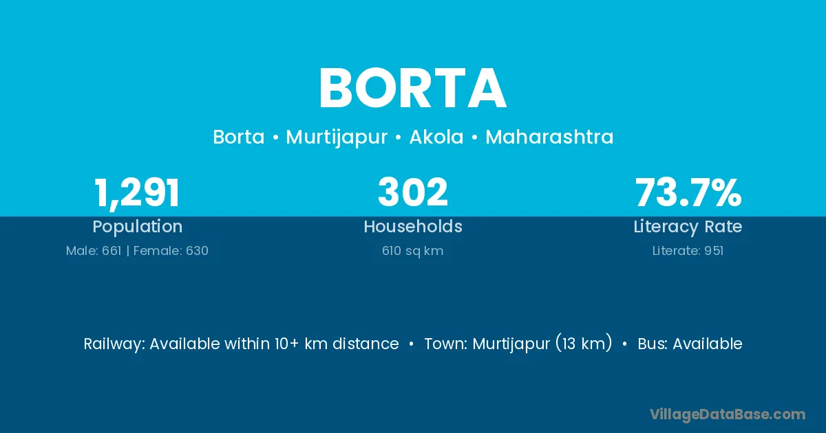 Murtijapur (13 km) is the nearest town to Borta village for major economic activities and is located approximately 13 km away.