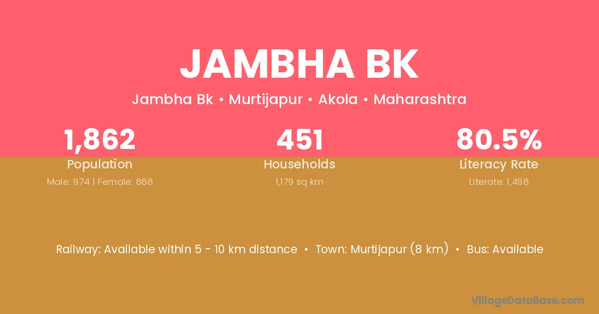 Murtijapur (8 km) is the nearest town to Jambha Bk village for major economic activities and is located approximately 8 km away.