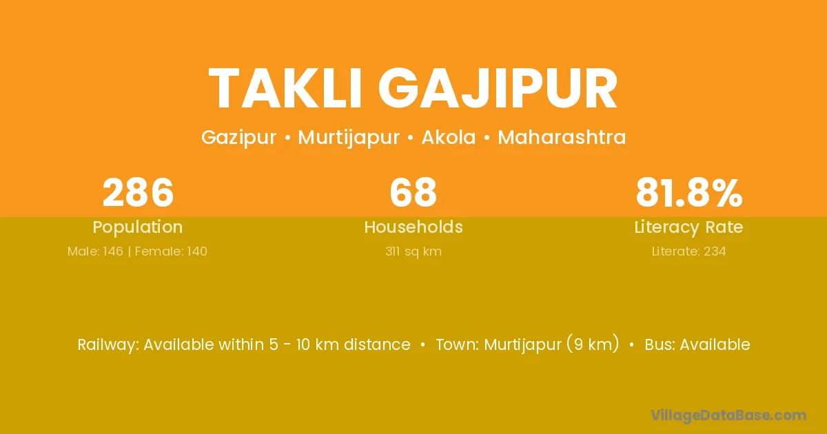 Murtijapur (9 km) is the nearest town to Takli Gajipur village for major economic activities and is located approximately 9 km away.