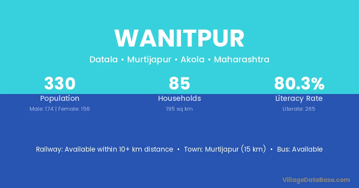 Murtijapur (15 km) is the nearest town to Wanitpur village for major economic activities and is located approximately 15 km away.