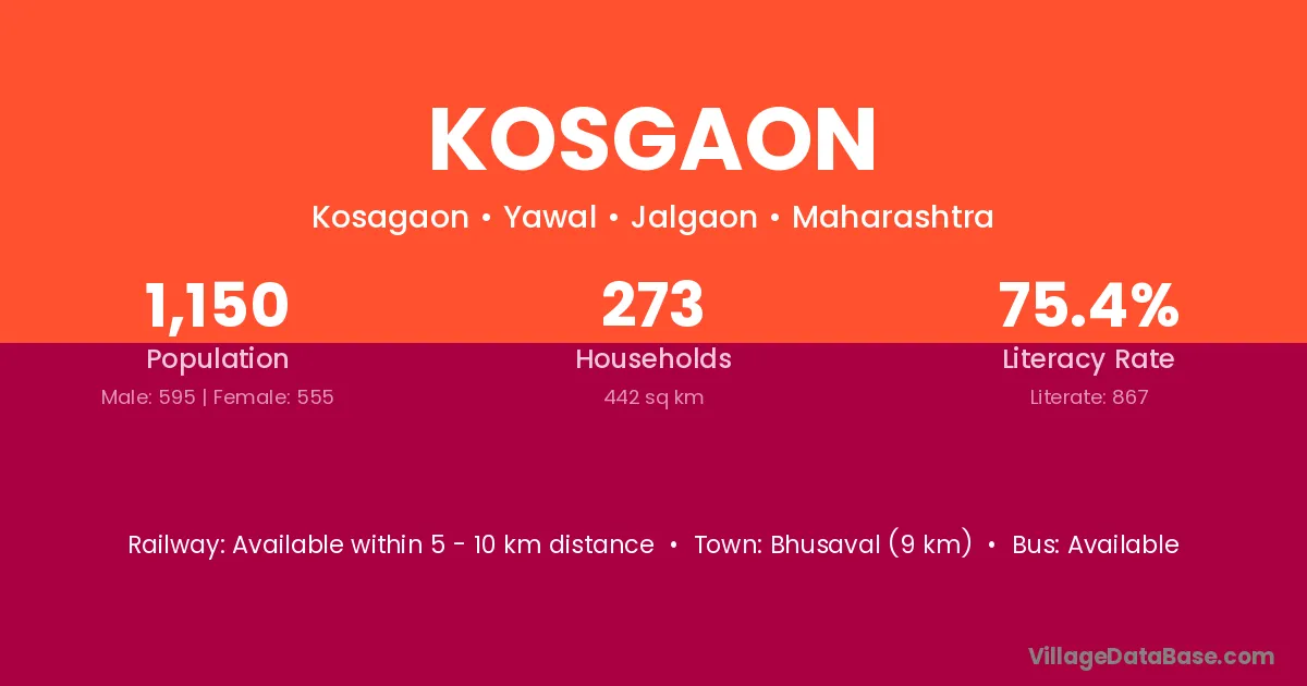 Patur (21 km) is the nearest town to Kosgaon village for major economic activities and is located approximately 21 km away.