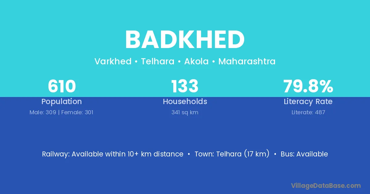Telhara (17 km) is the nearest town to Badkhed village for major economic activities and is located approximately 17 km away.