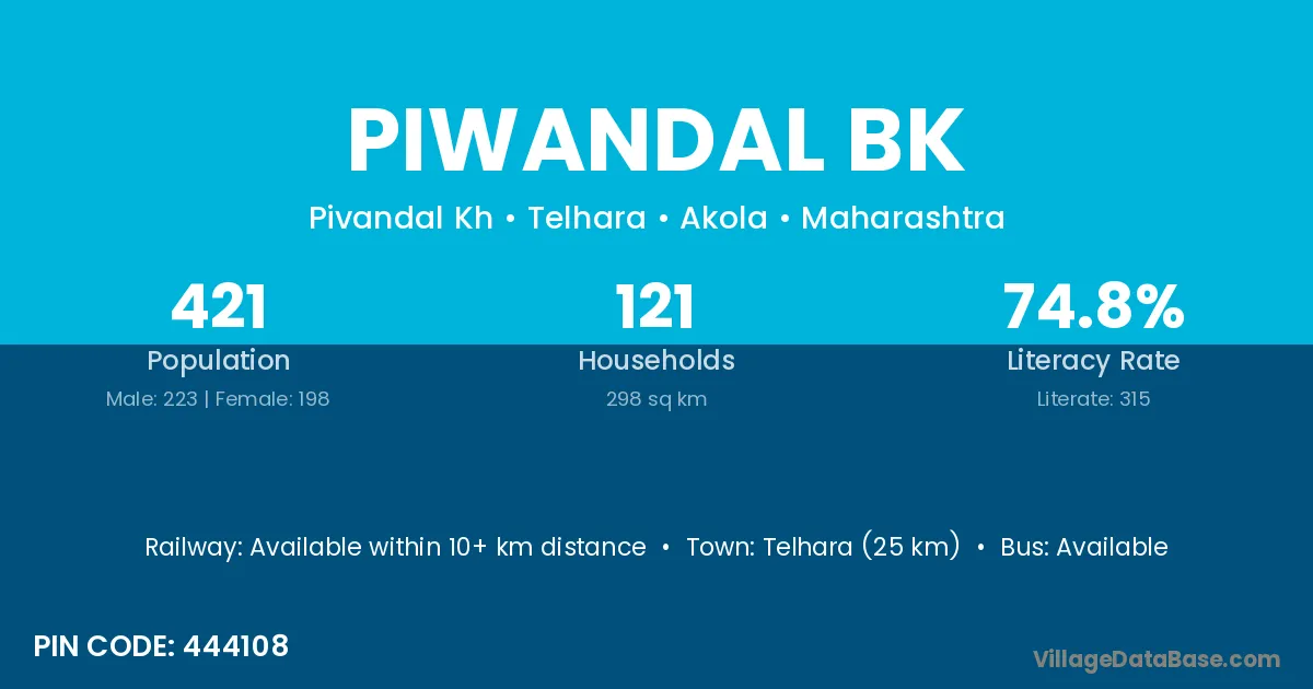 Telhara (25 km) is the nearest town to Piwandal Bk village for major economic activities and is located approximately 25 km away.