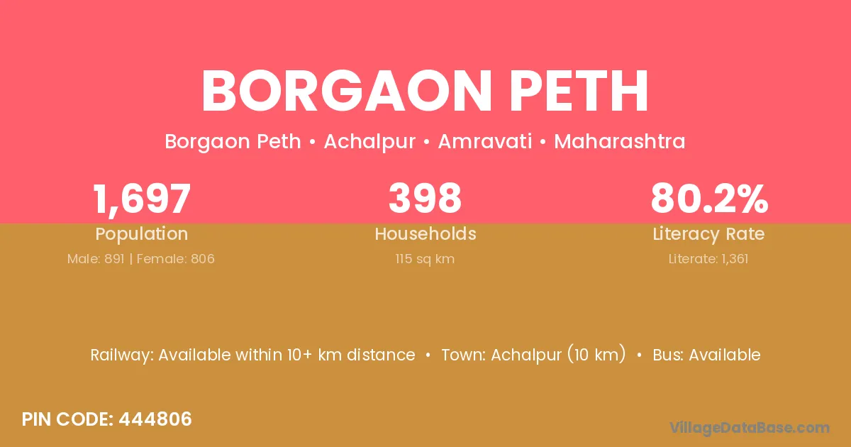 Achalpur (10 km) is the nearest town to Borgaon Peth village for major economic activities and is located approximately 10 km away.