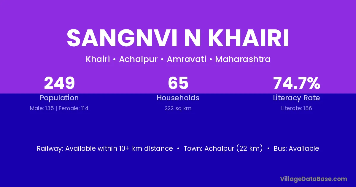 Achalpur (22 km) is the nearest town to Sangnvi N Khairi village for major economic activities and is located approximately 22 km away.