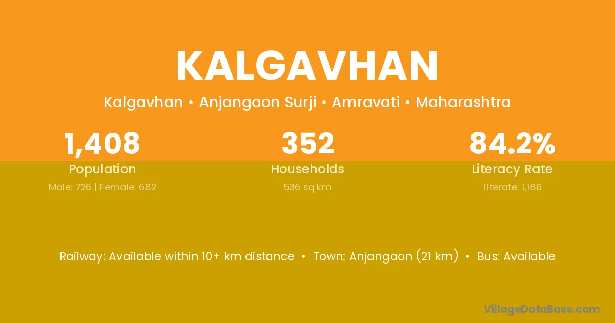 Anjangaon (21 km) is the nearest town to Kalgavhan village for major economic activities and is located approximately 21 km away.