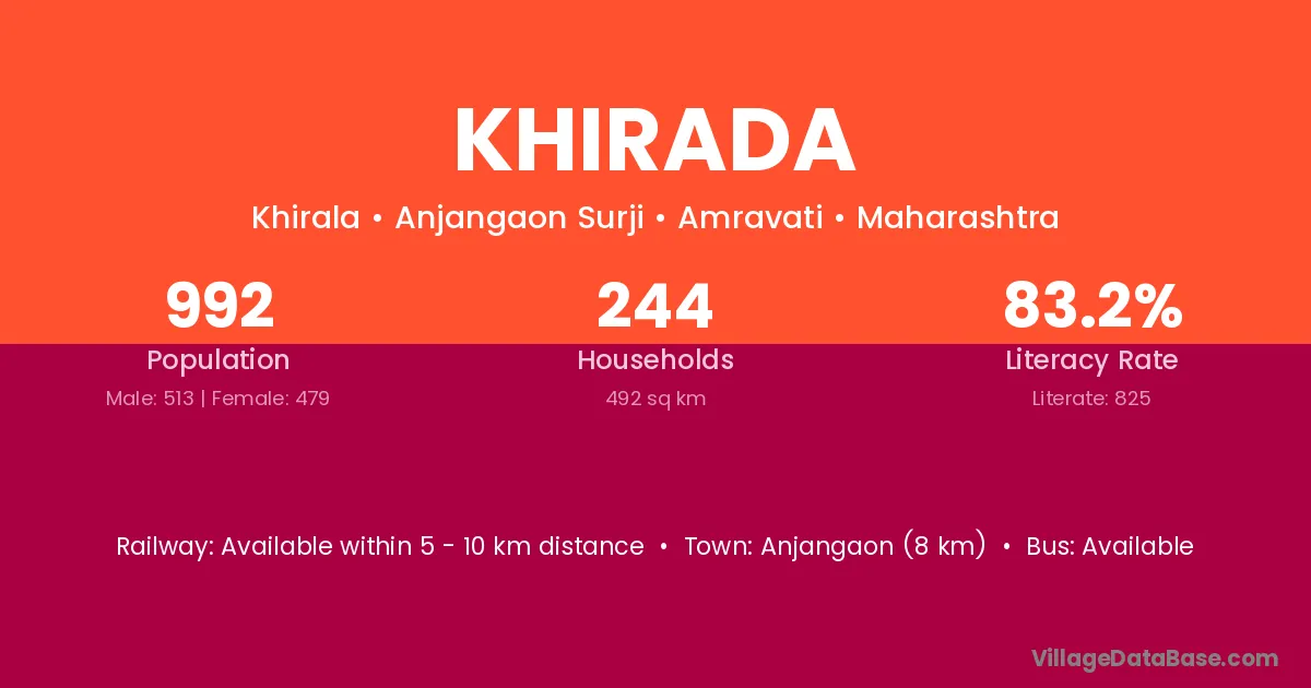 Anjangaon (8 km) is the nearest town to Khirada village for major economic activities and is located approximately 8 km away.