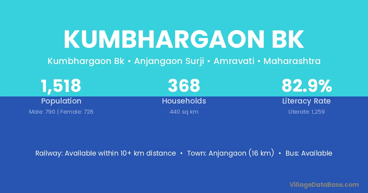 Anjangaon (16 km) is the nearest town to Kumbhargaon Bk village for major economic activities and is located approximately 16 km away.
