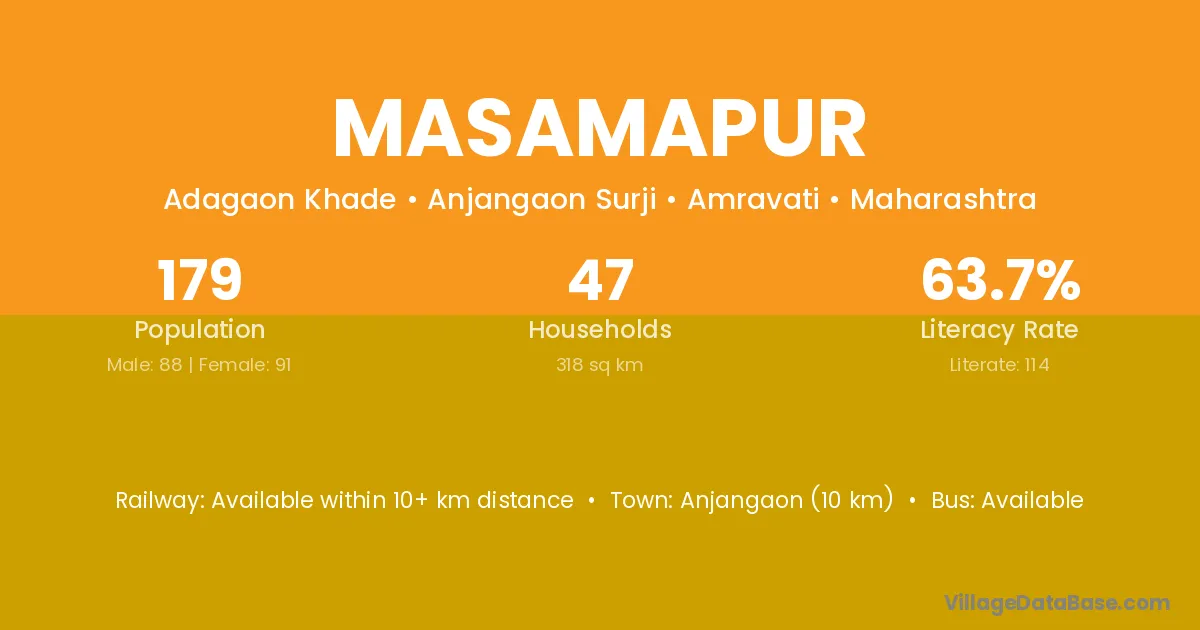 Anjangaon (10 km) is the nearest town to Masamapur village for major economic activities and is located approximately 10 km away.