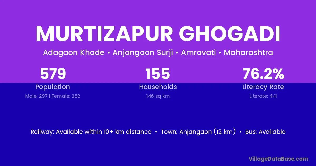 Murtizapur Ghogadi village has a total population of 579 people, of which 297 are males and 282 are females.