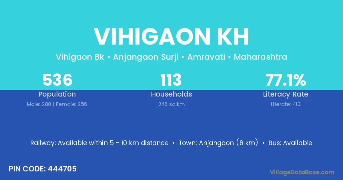 Anjangaon (6 km) is the nearest town to Vihigaon Kh village for major economic activities and is located approximately 6 km away.