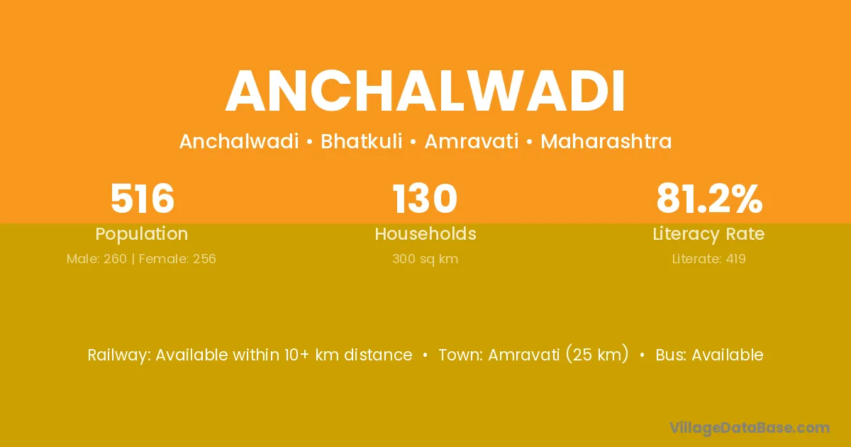 Anchalwadi village has a total population of 516 people, of which 260 are males and 256 are females.