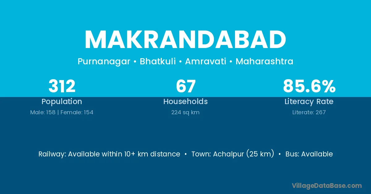 Achalpur (25 km) is the nearest town to Makrandabad village for major economic activities and is located approximately 25 km away.
