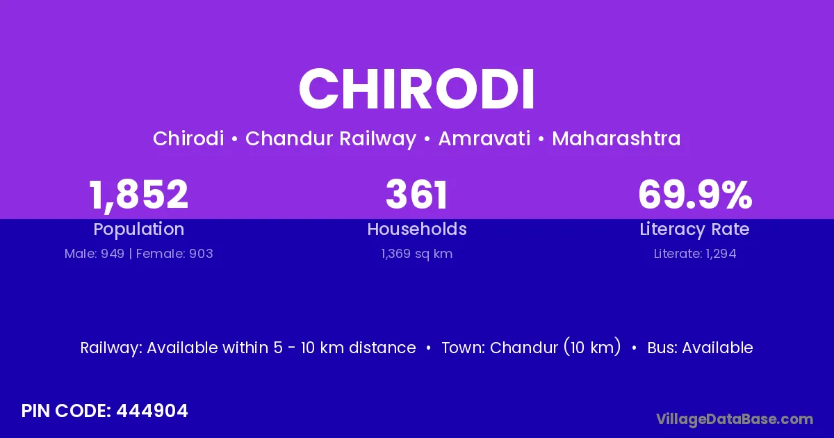 Chandur (10 km) is the nearest town to Chirodi village for major economic activities and is located approximately 10 km away.