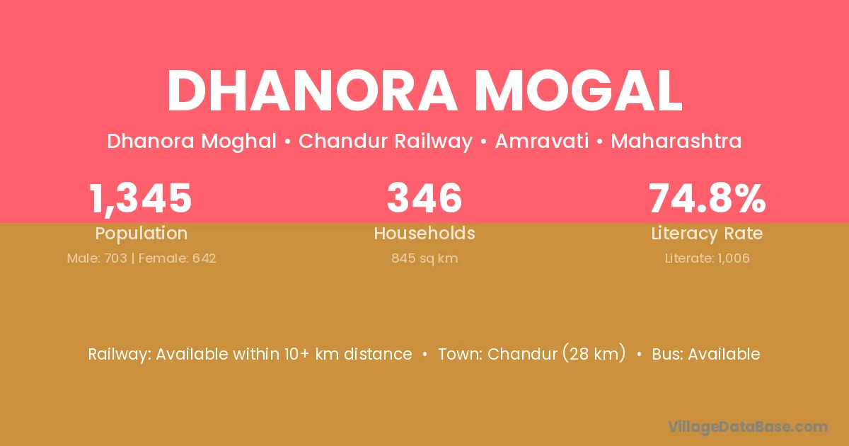 Chandur (28 km) is the nearest town to Dhanora Mogal village for major economic activities and is located approximately 28 km away.