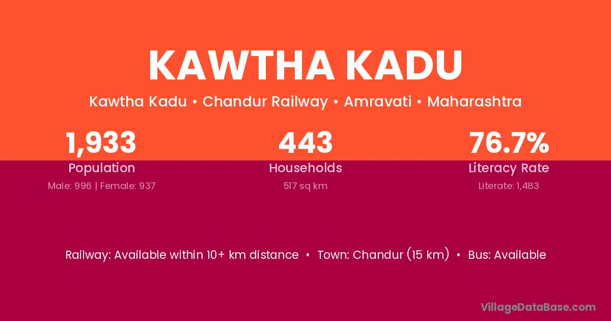 Kawtha Kadu village has a total population of 1,933 people, of which 996 are males and 937 are females.