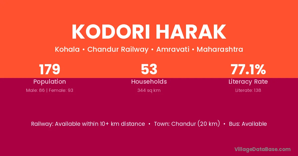 Chandur (20 km) is the nearest town to Kodori Harak village for major economic activities and is located approximately 20 km away.