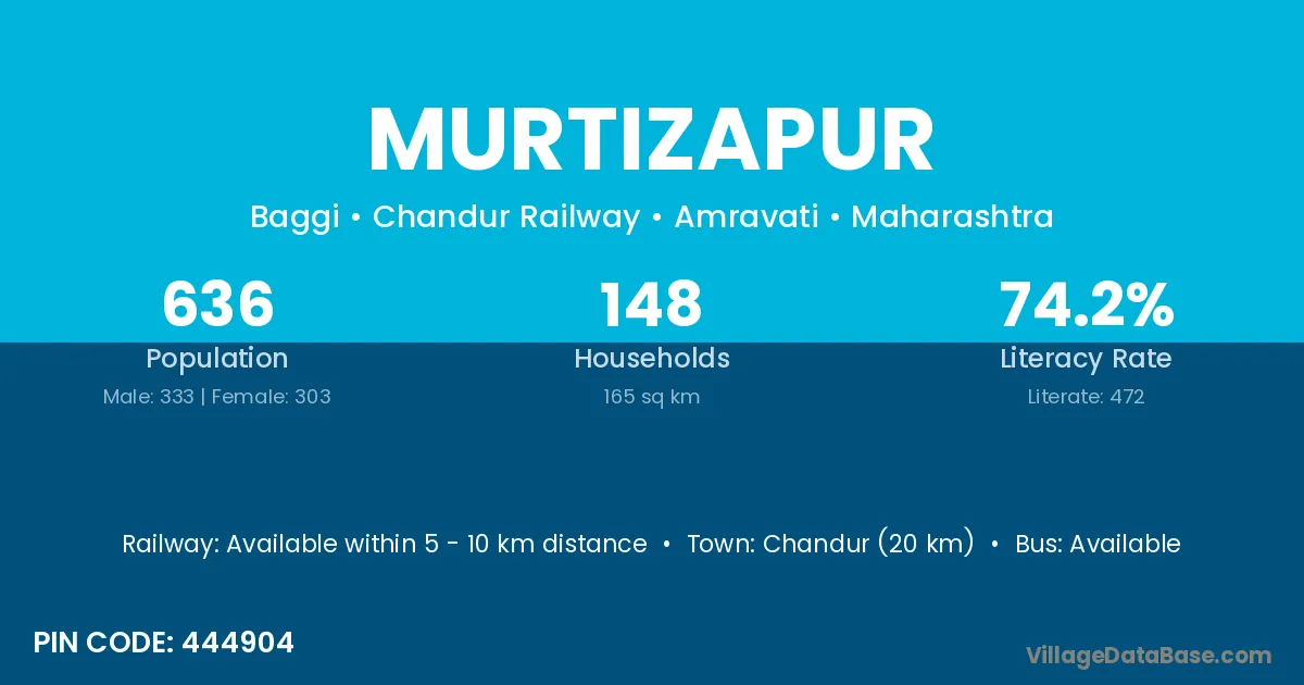 Chandur (20 km) is the nearest town to Murtizapur village for major economic activities and is located approximately 20 km away.