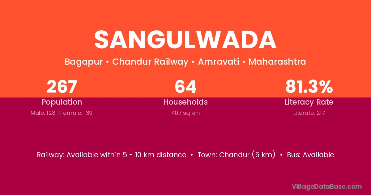 Chandur (5 km) is the nearest town to Sangulwada village for major economic activities and is located approximately 5 km away.