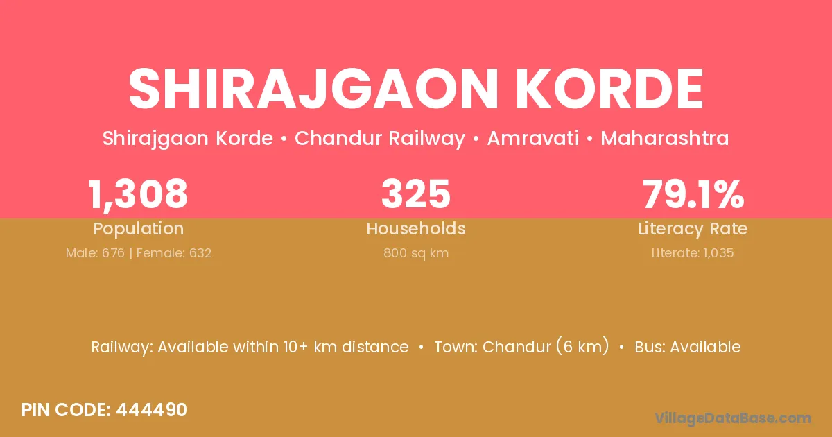 Shirajgaon Korde village has a total population of 1,308 people, of which 676 are males and 632 are females.