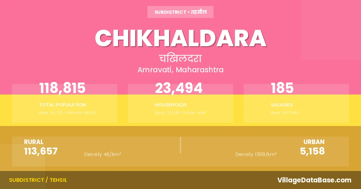 According to the 2011 census The total area of Chikhaldara Tehsil is 2477 km², with a population of 118815 people. The population density is 48 inhabitants per square kilometre, and there are approximately 23494 houses in the sub district.