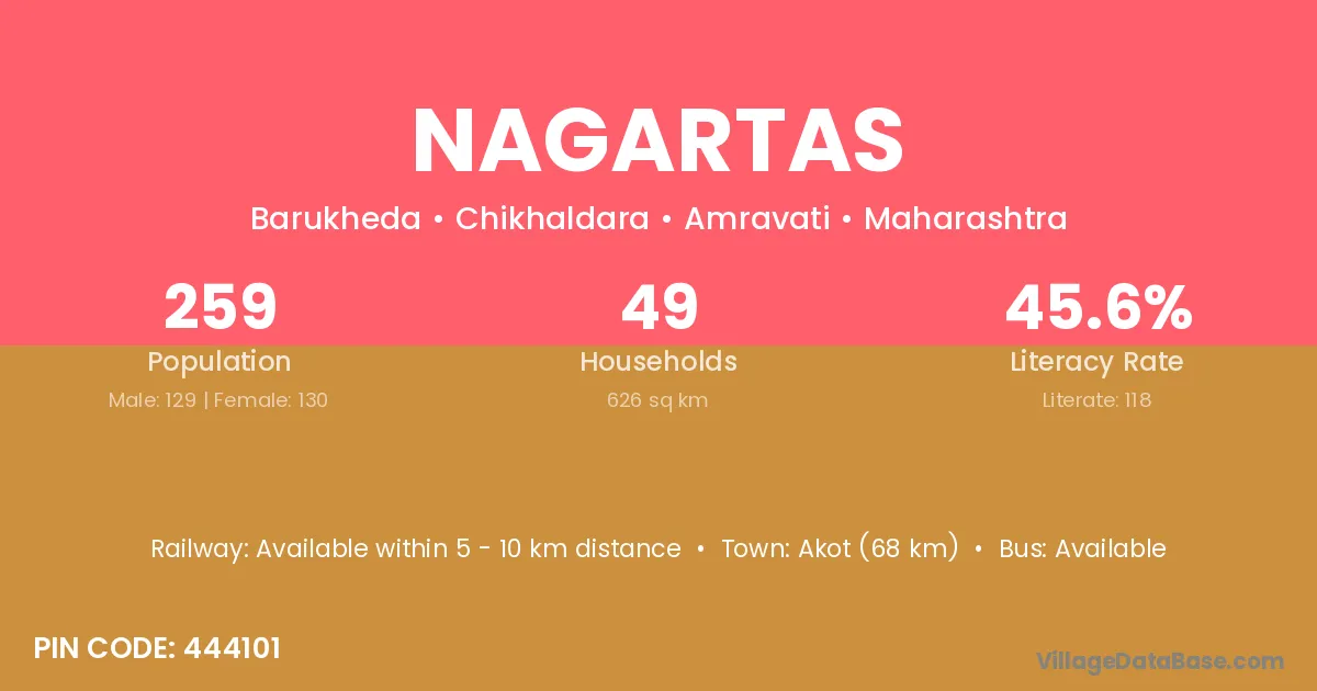 Akot (68 km) is the nearest town to Nagartas village for major economic activities and is located approximately 68 km away.