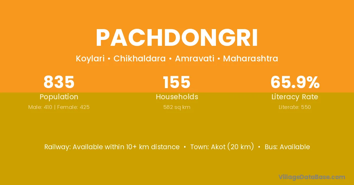 Akot (20 km) is the nearest town to Pachdongri village for major economic activities and is located approximately 20 km away.