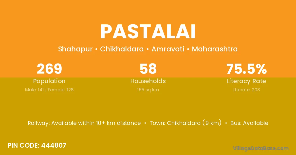 Chikhaldara (9 km) is the nearest town to Pastalai village for major economic activities and is located approximately 9 km away.