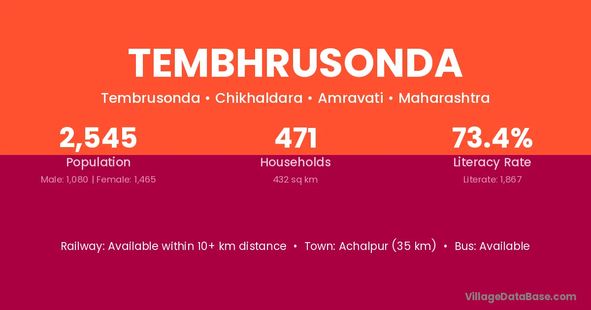 Achalpur (35 km) is the nearest town to Tembhrusonda village for major economic activities and is located approximately 35 km away.