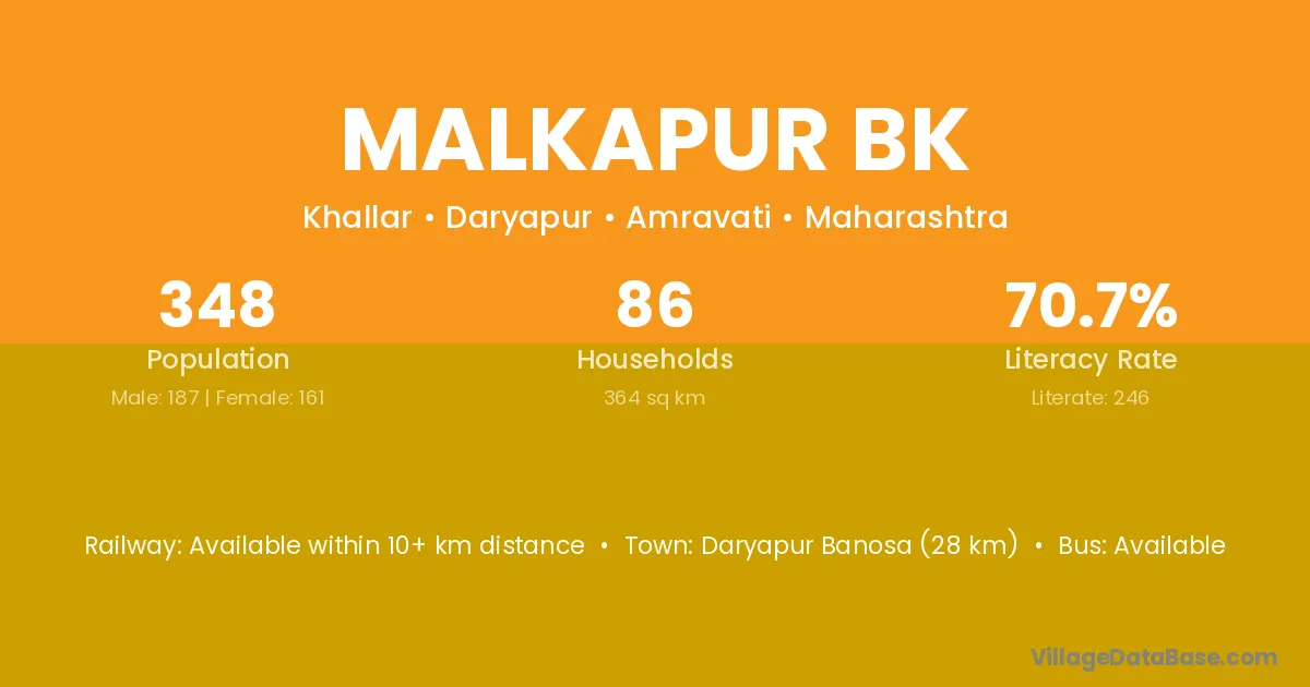 Daryapur Banosa (28 km) is the nearest town to Malkapur Bk village for major economic activities and is located approximately 28 km away.