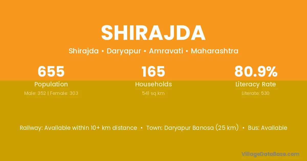 Shirajda village has a total population of 655 people, of which 352 are males and 303 are females.