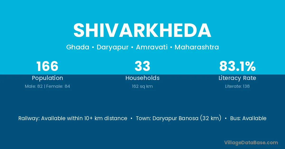 Daryapur Banosa (32 km) is the nearest town to Shivarkheda village for major economic activities and is located approximately 32 km away.