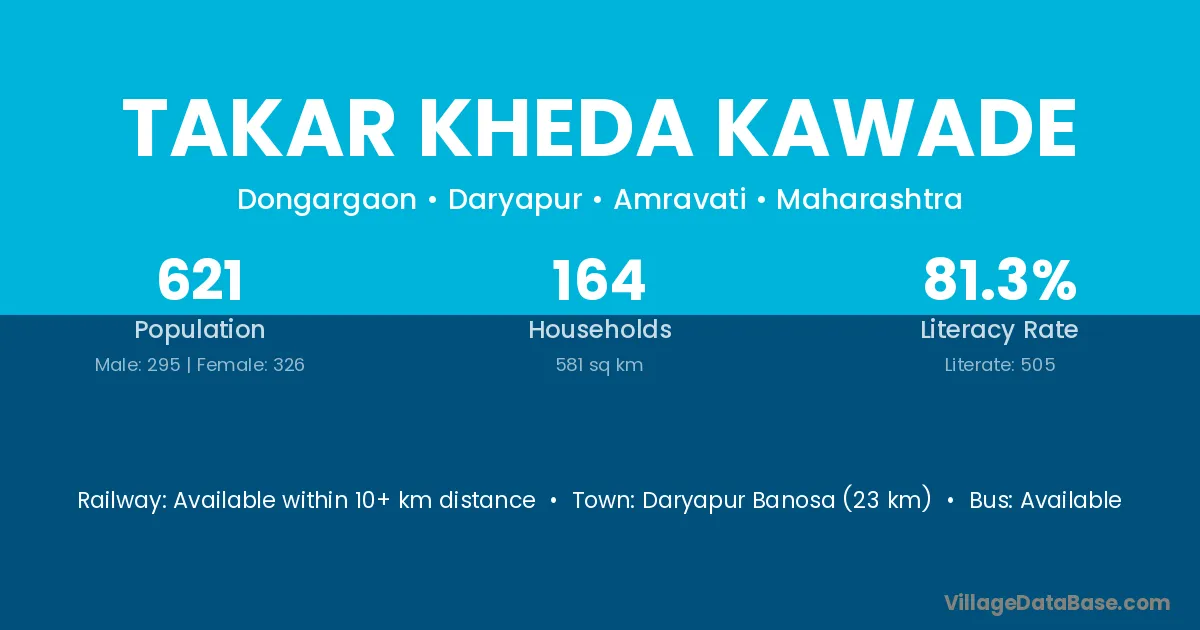 Takar Kheda Kawade village has a total population of 621 people, of which 295 are males and 326 are females.