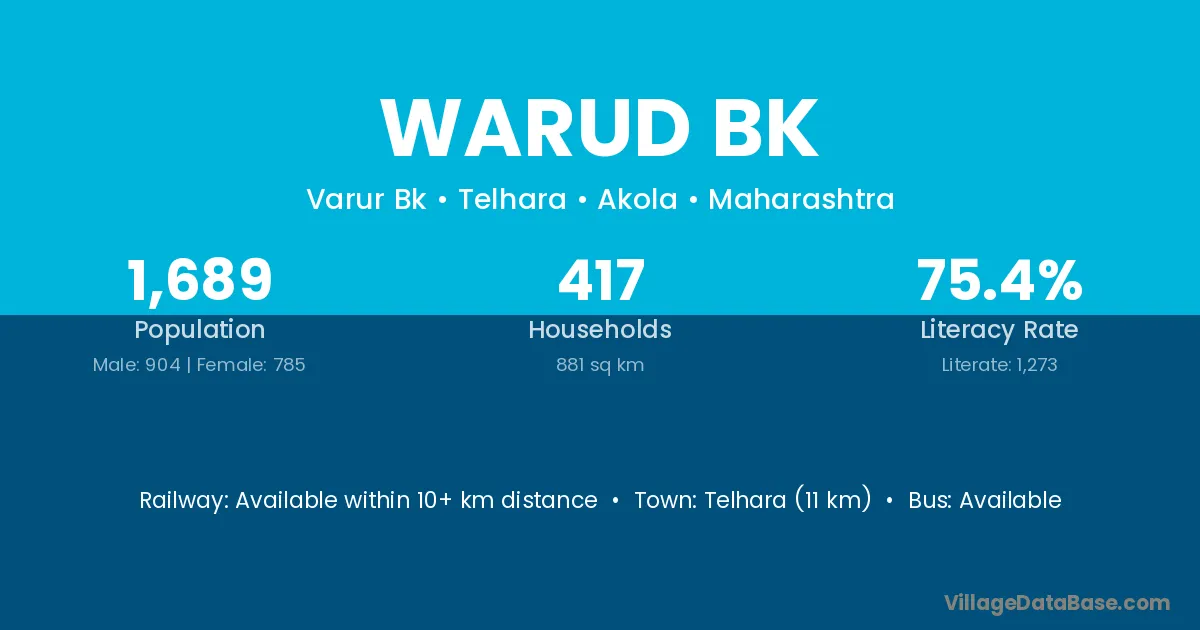 Daryapur Banosa (22 km) is the nearest town to Warud Bk village for major economic activities and is located approximately 22 km away.