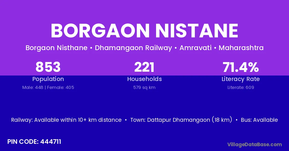Borgaon Nistane village has a total population of 853 people, of which 448 are males and 405 are females.