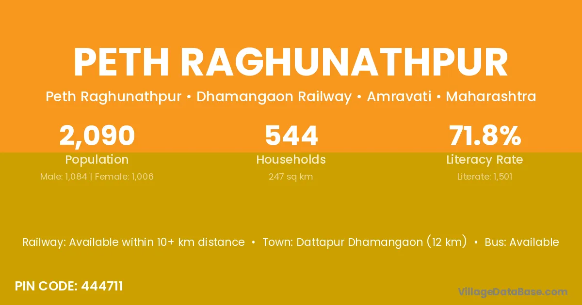 Dattapur Dhamangaon (12 km) is the nearest town to Peth Raghunathpur village for major economic activities and is located approximately 12 km away.