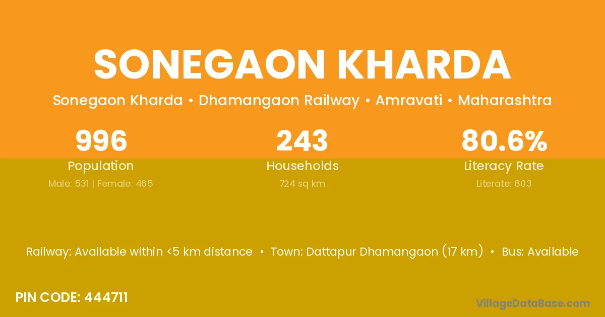 Dattapur Dhamangaon (17 km) is the nearest town to Sonegaon Kharda village for major economic activities and is located approximately 17 km away.