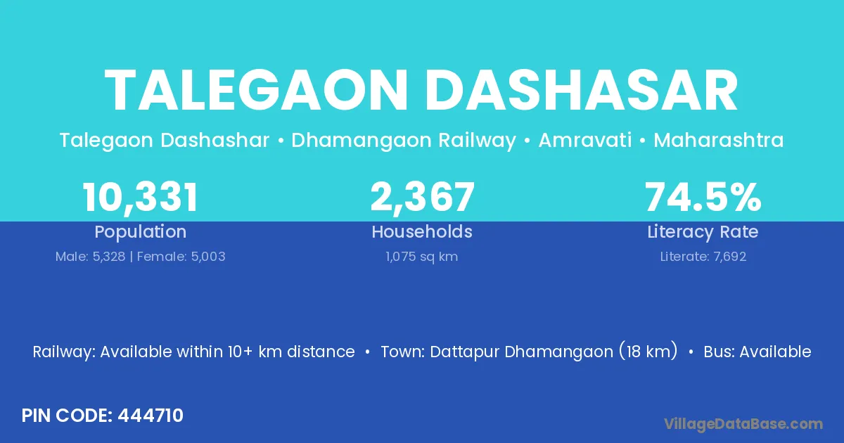 Dattapur Dhamangaon (18 km) is the nearest town to Talegaon Dashasar village for major economic activities and is located approximately 18 km away.
