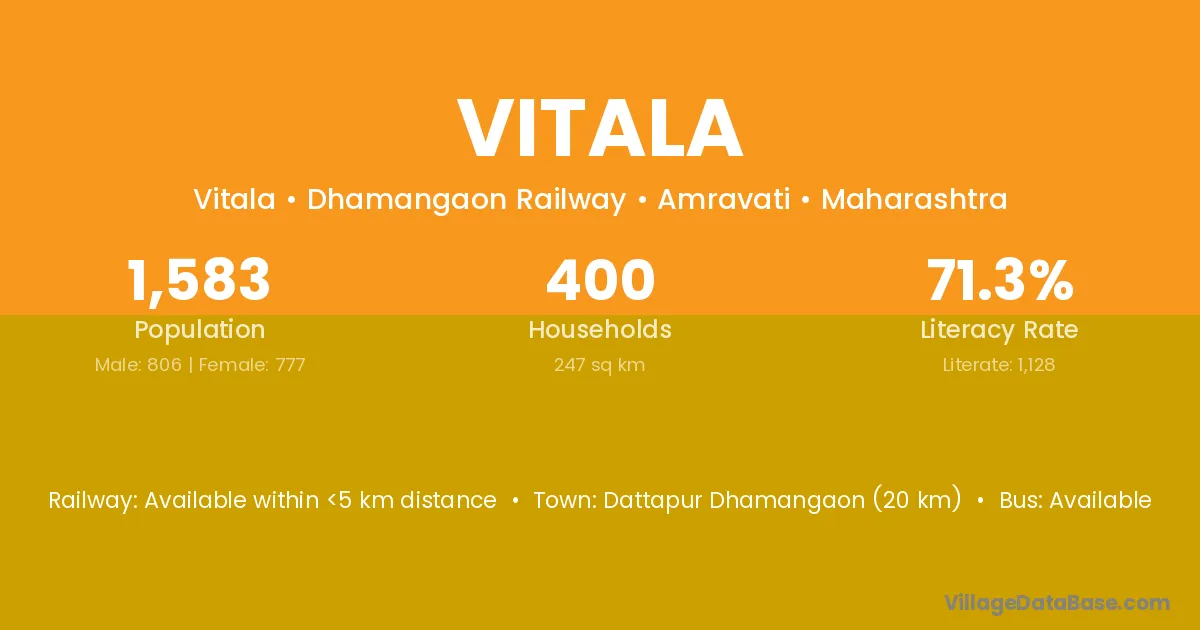 Dattapur Dhamangaon (20 km) is the nearest town to Vitala village for major economic activities and is located approximately 20 km away.