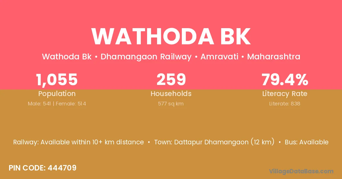 Dattapur Dhamangaon (12 km) is the nearest town to Wathoda Bk village for major economic activities and is located approximately 12 km away.