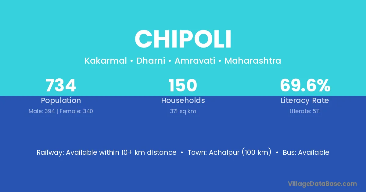 Achalpur (100 km) is the nearest town to Chipoli village for major economic activities and is located approximately 100 km away.