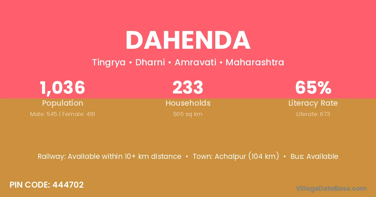 Achalpur (104 km) is the nearest town to Dahenda village for major economic activities and is located approximately 104 km away.