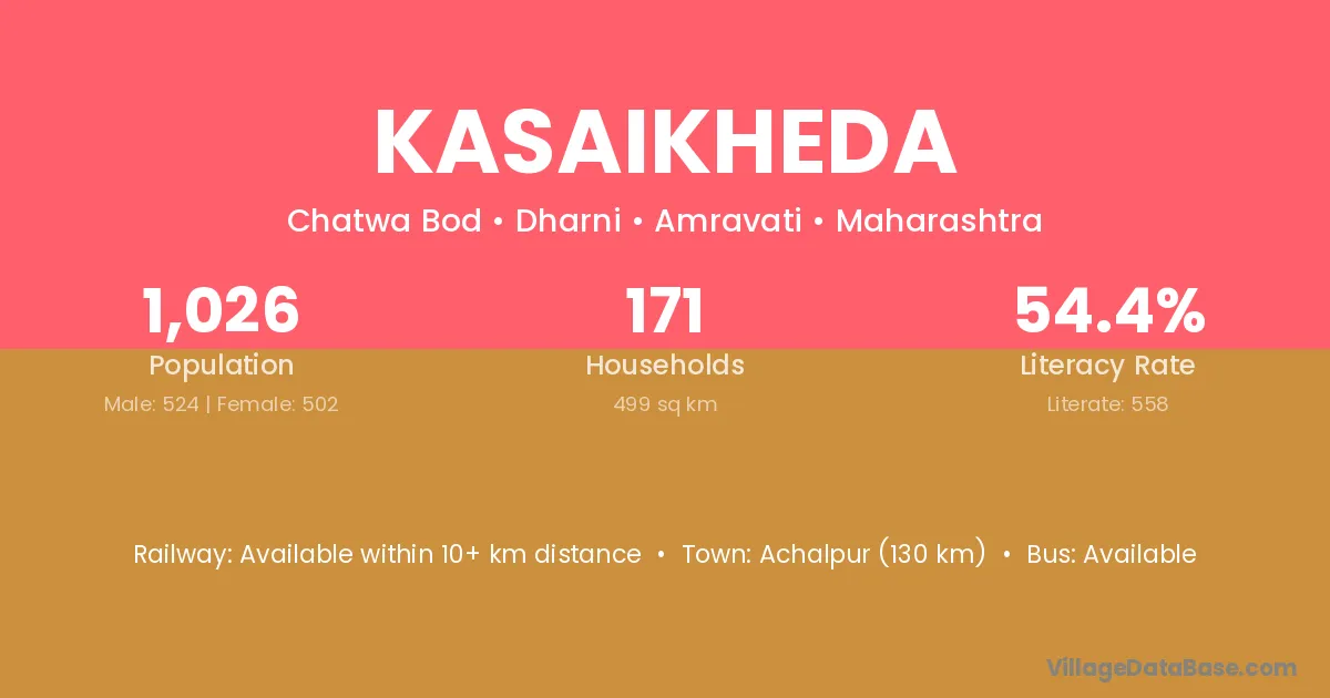 Achalpur (130 km) is the nearest town to Kasaikheda village for major economic activities and is located approximately 130 km away.