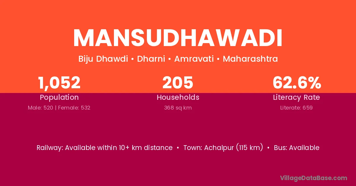 Achalpur (115 km) is the nearest town to Mansudhawadi village for major economic activities and is located approximately 115 km away.