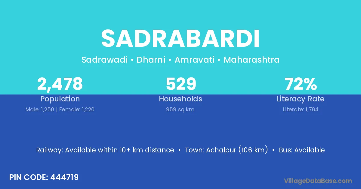 Achalpur (106 km) is the nearest town to Sadrabardi village for major economic activities and is located approximately 106 km away.