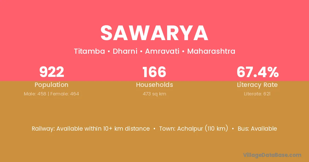 Achalpur (110 km) is the nearest town to Sawarya village for major economic activities and is located approximately 110 km away.