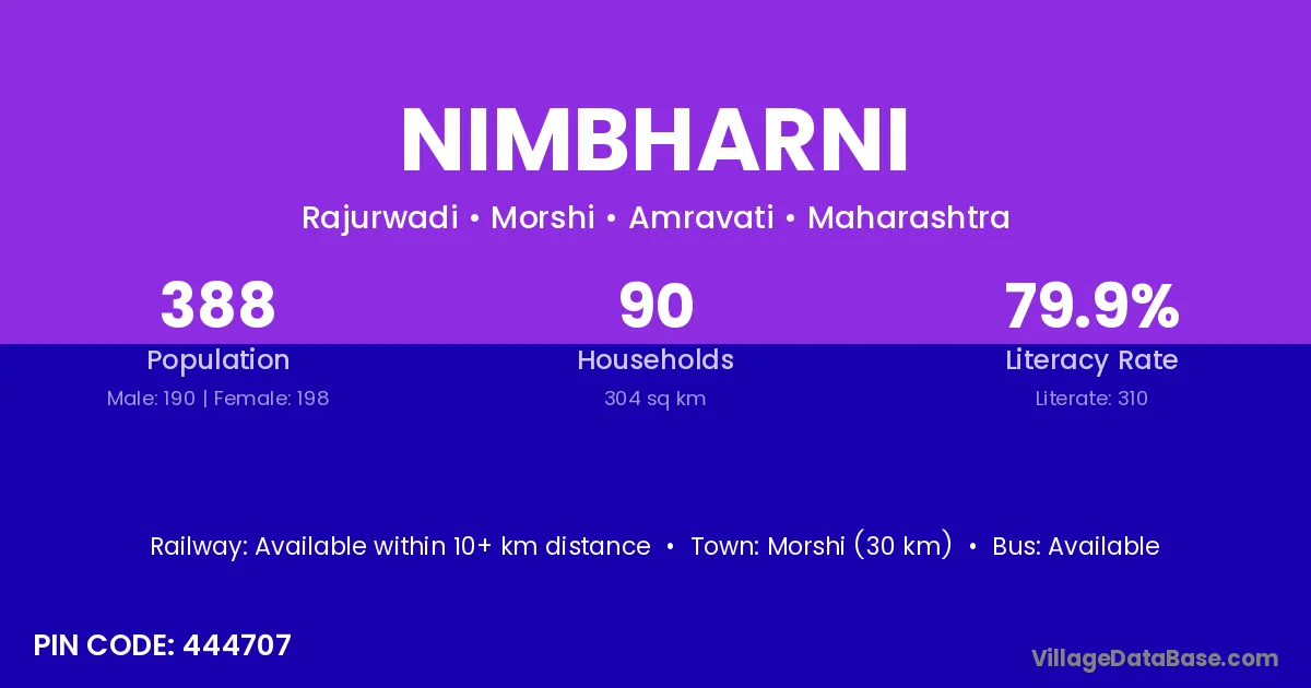 Morshi (30 km) is the nearest town to Nimbharni village for major economic activities and is located approximately 30 km away.