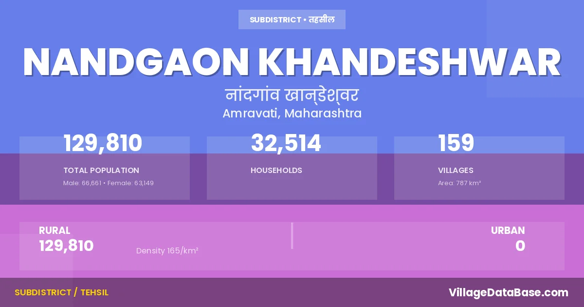 According to the 2011 census The total area of Nandgaon Khandeshwar Tehsil is 787 km², with a population of 129810 people. The population density is 165 inhabitants per square kilometre, and there are approximately 32514 houses in the sub district.