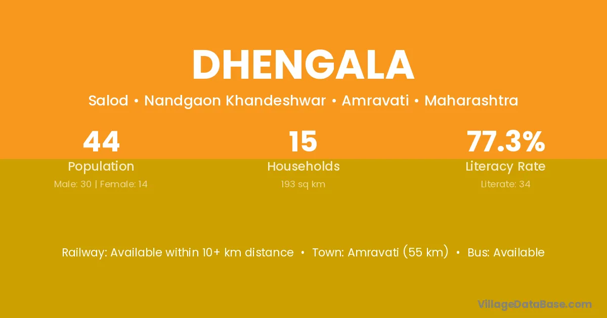 Amravati (55 km) is the nearest town to Dhengala village for major economic activities and is located approximately 55 km away.